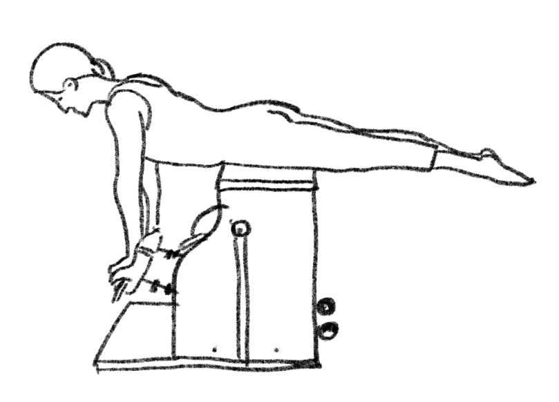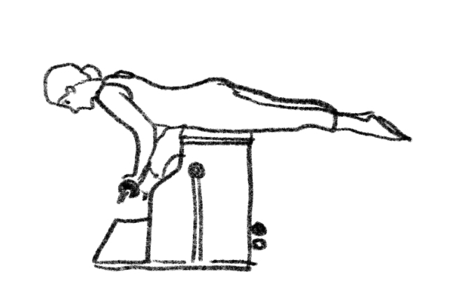 【起始位】俯卧于椅子上,手在踏板上,手臂伸直。肩部微于手后方的位置,腿延伸长放于床身或箱子上。【呼吸】吸气时让肩胛后收,踏板上移动;吐气时肩胛前引,踏板下压。肩胛动,躯干不动。【想象】肩胛骨像两扇滑动门在背后开合。