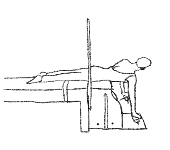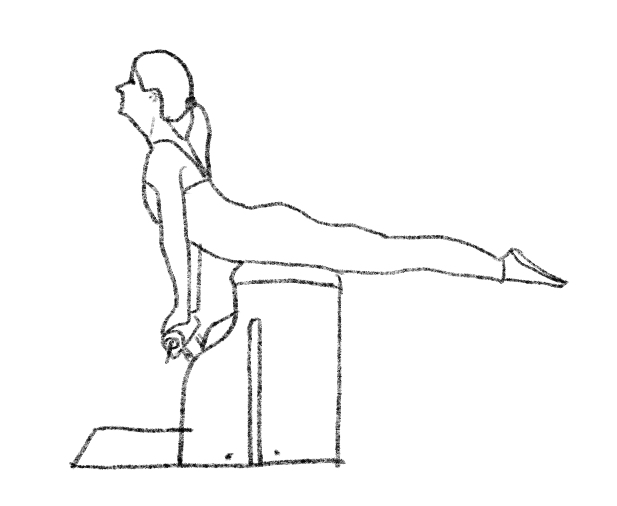 【起始位】俯卧在椅子Chair上,手在踏板上,手臂伸直。肩胛微在手的后方位置,最下方的肋骨靠近椅子的边缘。腿部伸延长放在床体或箱子上。脊椎/骨盆中立位。【呼吸模式】吸气时延伸脊椎;吐气时,颈椎、胸椎依顺序伸展后仰,可依照需求一直延伸到腰椎;吸气,脊椎一节一节地弯曲,从腰椎依顺序回到起始位置。【想象】脊柱像一串向上拉起的珍珠项链。