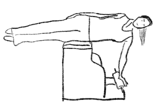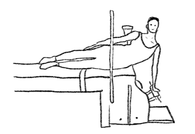 【起始位】侧躺,下方的侧腰对齐椅子上方。手放在踏板上,肩膀在手的上方。上方的手臂/手掌放在身体侧边。【呼吸模式】吐气时做脊柱侧弯动作,上方的手往膝盖方向滑动;吸气时回到起始姿势,往内收紧下段的肋骨。【想象】身体像一把拉开的扇子。