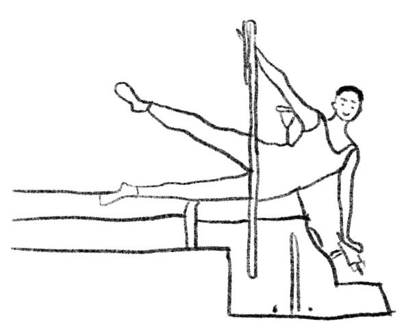 1条重的弹簧在第2个或第3个挂钩固定好;只用椅子Chair或是加上秋千床或两个叠起来的箱子;为下方的手在踏板上放止滑垫;髂骨的下方放软垫。