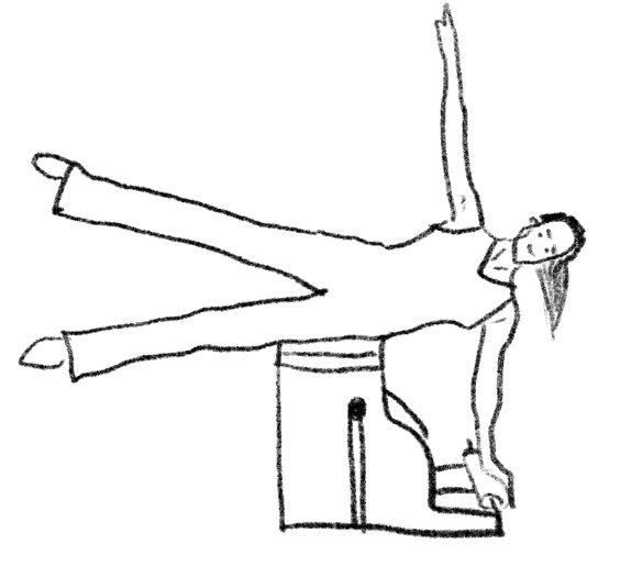 Starting position: Side-lying, lower waist aligned with chair top. Bottom hand on pedal, shoulder over hand. Top arm/hand by side. Breathing: Exhale to laterally flex spine, top hand slides toward knee; inhale to return, drawing lower ribs in. Imagery: Body like an opened fan.