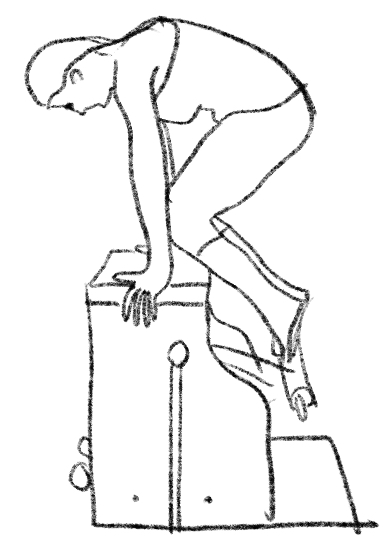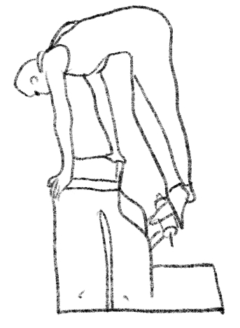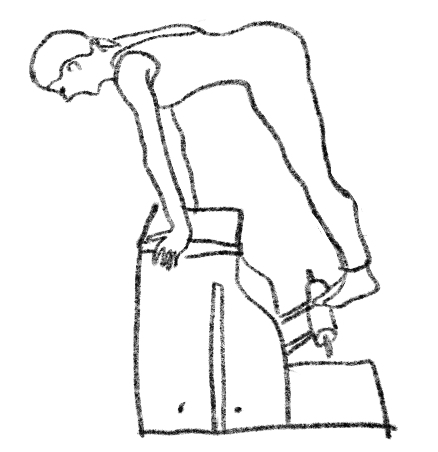 【起始位】站立面对椅子,双手放在椅面边缘,脚尖踩在踏板上,身体呈倒“V”型(C型脊柱)。【呼吸模式】吐气时双手下压椅面,将身体撑起并保持脊柱屈曲;吸气时有控制地慢慢让踏板压下。【想象】身体像一个正在移动的坚固拱桥。