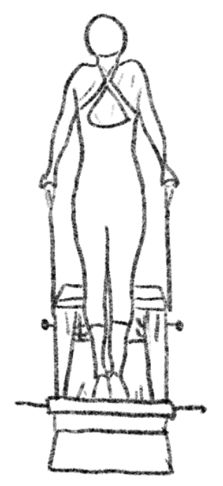 Starting positions: Facing In: Stand on pedals on toes, facing chair, hold handles, elbows straight but not locked. Facing Out: Stand on pedals facing away from chair, hold handles. Breathing: Facing In: Inhale extend trunk, widen scapulae; exhale bend elbows, avoiding humeral head protraction, press body up/down. Facing Out: Inhale extend trunk; exhale bend elbows, press body up. Imagery: Body like a precise support moving on parallel bars.