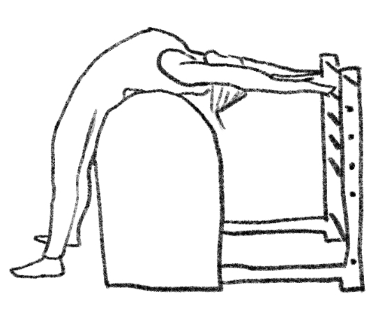 Starting position: Stand in front of barrel, sacrum against barrel edge. Movement: Inhale, lengthen spine; Exhale, gently lift arms, roll spine back onto barrel surface. Hold ladder at first rung, move down step by step. Hold position for several breaths, allowing spine to relax. Exhale, reach arms toward ceiling, articulate spine back up to start. Imagery: Spine like a string of pearls draping over the barrel one by one.