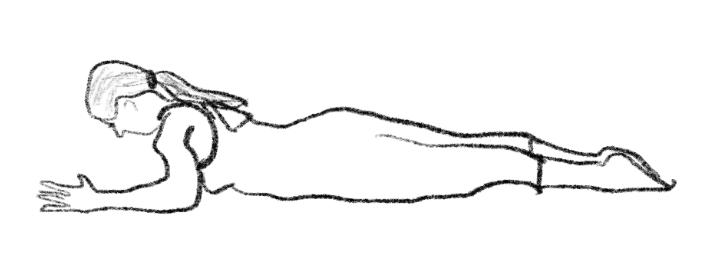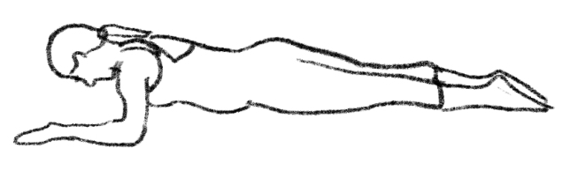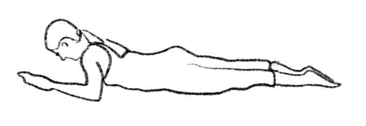 Starting position: Prone, arms in 'E' shape (shoulders abducted, elbows bent 90°, forearms toward head). Spine neutral, feet together. Head slightly lifted, aligned with spine. Breathing/Movement: Inhale, externally rotate arms, lift hands/forearms. Exhale, lift elbows, keeping hands higher. Inhale, extend thoracic spine, continue external rotation. Exhale, extend arms overhead, straight elbows, reaching diagonally up. Inhale, return arms to 'E' shape, maintaining body height. Exhale, control trunk roll down to mat, maintaining arm height. Elbows down, hands still higher, finally forearms down. Imagery: Arms like scarecrow limbs, clear angles and strength at joints; from elbow to fingertip, a long straight line reaching into distance.