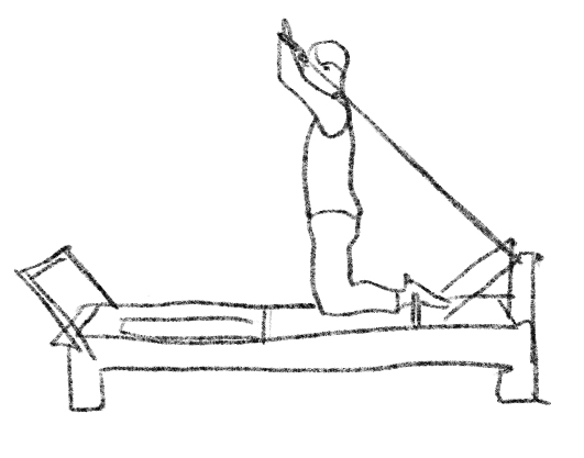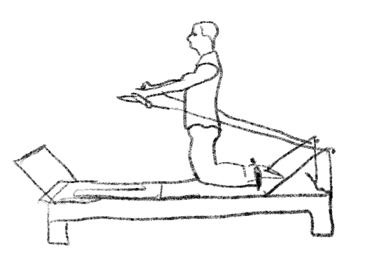 【Starting Position】Seated or high kneeling, facing the footbar. Hold the straps or loops, palms up, arms bent at the sides in a neutral alignment. 【Safety Considerations】Cue the client to maintain balance and move smoothly. The instructor should maintain tactile cues at the client's sternum until they master the dynamic phase. 【Movement/Breathing Recommendations】 【Serving】 Exhale: Palms up, extend arms forward as if steadily offering a tray; Inhale: Keep the scapulae stable against the ribcage and return elbows to the starting position with control. 【Shoulder Flexion】 Exhale: Flex shoulders with palms up; Inhale: Return to the starting position with elbows slightly bent. 【Triceps Press / Salute】 Hands against the forehead, fingers close together. Exhale: Press hands diagonally upward and outward, palms facing out, keeping the upper trapezius relaxed; Inhale: Bend elbows to return to the starting position with fingers near the forehead, maintaining a sense of space at the back of the neck and returning with control. 【Hug A Tree】 Fingers facing each other, hands and elbows slightly lower than shoulder height. Exhale: Circle the arms as if hugging a large tree, feeling the collarbones widen; Inhale: Maintain thoracic width while opening the arms at a steady pace. 【Variations】 All variations can be performed seated on a Long Box.