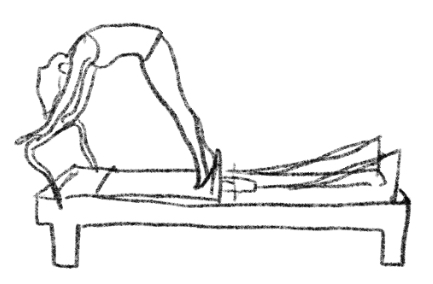 起始位:1. Elephant-站在滑板上,手扶脚踏杆,身体呈倒 V 型。2. Long Stretch-俯卧撑姿势,脚跟抵住肩靠。3. Jackrabbit-俯卧撑姿势,膝盖弯曲靠近胸口。动作:Elephant-吐气推开滑板,吸气拉回。Long Stretch-吸气肩关节伸展将床推开,吐气拉回。想象提示:身体像一块坚硬的钢板,在空间中水平移动。