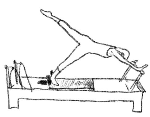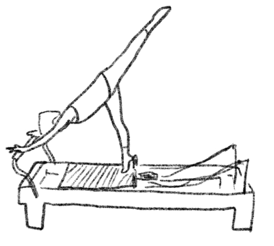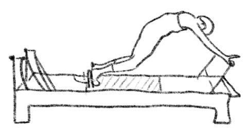 【Direct】While the carriage moves back, maintain a constant vertical distance between the lower ribs and the ASIS. Keep the opposition between the crown of the head and the sit bones toward opposite poles of the room. Focus on keeping the medial borders of the scapulae flat against the posterior ribs, resisting spring tension to prevent shrugging. 【Indirect】Precision Compass: Imagine your torso as the fixed needle of a precision compass; as the carriage moves, the shoulders remain still as the center while the body swings accurately like a scale line. Rising Tide Buoyancy: Imagine an invisible tide slowly rising beneath your pelvis, weightlessly lifting your sacrum and distributing weight evenly to the feet. Cocked Crossbow: Imagine the body as a fully drawn crossbow frame; though the carriage is in motion, the trunk structure remains extremely calm and solid. 【Space】Parallel Glass Gallery: Feel as if you are between two narrow, parallel glass walls; during the push and pull, the body never produces any lateral sway. Height Scanner: Imagine your tailbone touching an infrared height scanner; throughout the trajectory, ensure the tailbone's height in space remains absolutely constant. Energy Cone: Visualize a transparent energy cone narrowing from the shoulders to the heels; as the legs extend, pierce the tip of the cone deep into the void behind. 【Feeling】Stretching Warm Taffy: Feel the spring resistance like pulling a thick, warm clump of taffy; the movement carries a silky, steady, and highly eccentric viscous control. Air Compression Pad: Imagine a very thin air compression pad between your palms and the footbar; press down on this invisible cushion to gain an internal-to-external upward lift of the ribcage. Resonant String: Listen quietly to the sound of the carriage rollers, attempting to perfectly synchronize your movement rhythm with the slight vibration of the springs until the sound dissolves into your breath.