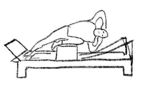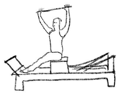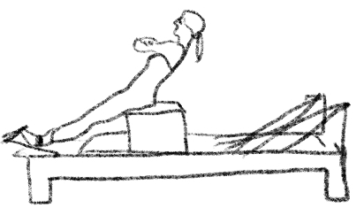 【Starting position】Sit on box, pelvis at least one hand-width from edge, facing carriage. Feet secured under straps, spine neutral. 【Movements/Breathing】 Round Back - Exhale to roll pelvis back and down, inhale hold, exhale return. Flat Back - Maintain neutral spine, initiate from hips to lean back. Sidebend - Side bend extending diagonally.Twist - Rotate from neutral spine, adding lateral flexion extension.Climb A Tree - Draw one knee toward chest, hand on back of thigh, sequentially climb up to ankle, maintaining spinal control.