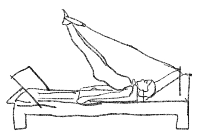 Starting position: Supine, arms by sides, feet in loops, legs parallel at 45°, pelvis neutral. Breathing: Inhale to adduct legs and lift them directly above torso. Exhale to initiate spinal articulation to vertical, supported on shoulders, keeping carriage still. Inhale to open legs shoulder-width apart. Exhale to articulate spine down from ribcage, keeping carriage still. Return to start. Repeat, starting with legs apart, ending adducted. Cue: Keep carriage still throughout roll.