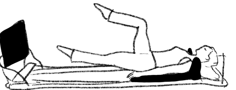 【起始位】仰卧,骨盆中立位,脚尖踩在跳板上,双膝微屈。【呼吸/建议】吸气:准备;吐气:快速伸展髋、膝、踝关节将滑板推离跳板(跳起),在空中保持中立位排列;回落:脚尖先着地,顺序为脚趾、脚掌、脚跟,屈膝缓冲回位。【提示】跳跃由站姿开始,不是下跳动作开始。
