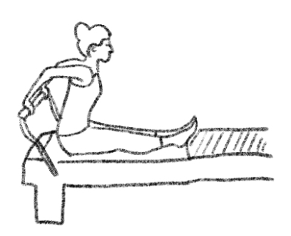 Springs: 1/1.5-2; foot bar elevated; sit on front edge of carriage, toes against carriage edge, hands on foot bar, palms forward.