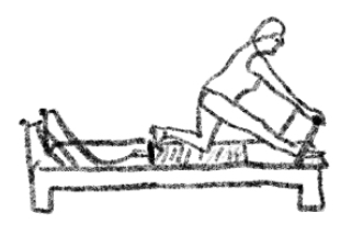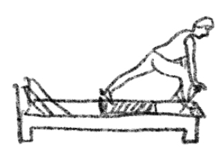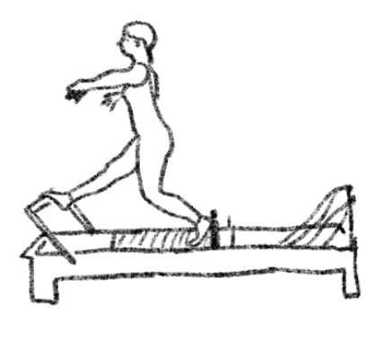 Starting positions: [Russian] Stand, one foot on foot bar, other on carriage edge, lean forward, hands on foot bar. [Front Split] Maintain level pelvis, exhale push carriage back, stretching back leg iliopsoas and front leg hamstrings; inhale return. [Lunge] Exhale bend back knee, inhale straighten.