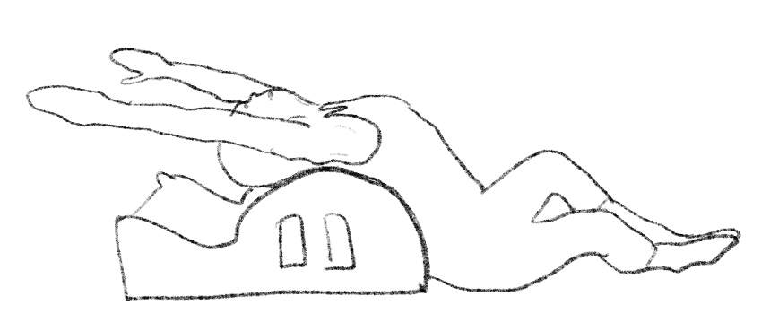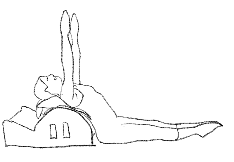 Starting position: Sit in front of the corrector, sacrum against the curved surface. Feet can be straight or bent. Arms abducted and extended to the sides. Breathing/Movement: Inhale, lengthen spine upward. Exhale, lift arms, simultaneously initiate from the head, articulating spine back segmentally onto the curved surface until entire back is supported and extended, arms may reach overhead. Hold for several breaths, feeling openness in the front. Exhale, engage core, articulate spine back up from the thoracic spine to return to starting seat. Imagery: Spine like a necklace gently placed on a curved jewel stand; front of body like a door slowly opening; back perfectly fits the corrector's curve.