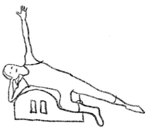 Starting position: Side-sit on corrector, hip in 'corner' (junction of apex and side). Inside leg bent, outside leg extended forward. Arm options: crossed on chest, behind head, overhead. Breathing/Movement: Inhale, prepare and lengthen spine. Exhale, engage lateral abdominals, sequentially wrap trunk over corrector's curve: hip, waist, lower ribs, upper ribs/shoulders, head. Inhale, hold at end, maintaining length. Exhale, control return in reverse order: head, shoulders, upper ribs, lower ribs, waist, hip. May exhale in both phases for more control. Imagery: Body like a wet towel gently wrung around the corrector's curve; side waist muscles like accordion bellows opening and closing evenly.