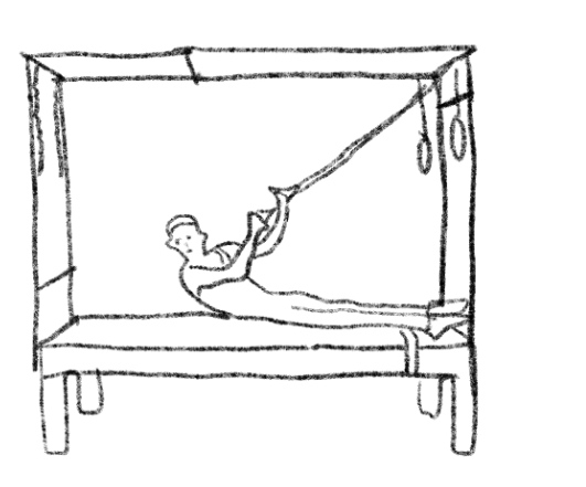 起始位:长坐姿,手握木杆。吸气:中轴延伸;吐气:分节下卷脊椎至仰卧位;吸气:维持;吐气:分节卷起。想象脊椎像剥离胶带。