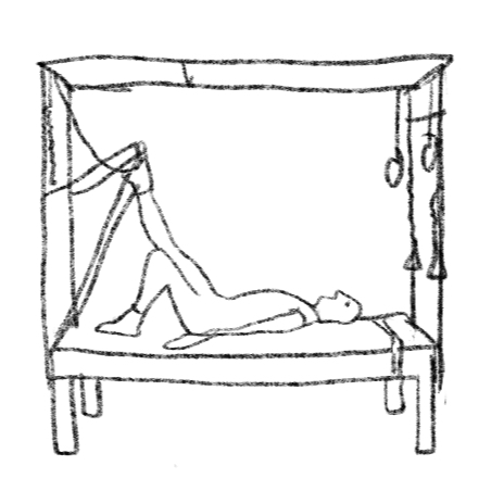【直接】关节机制:呼气向上推时,感受股骨头在髋臼窝中心进行深层旋入,在大腿移动时保持骨盆受力点纹丝不动。排列要求:伸展全程保持骶骨后侧与后胸廓均匀模刻在垫子上,维持脊柱自然中立。受力均衡:通过双脚脚球向塔杆施加绝对对称压力,利用弹簧阻力实时监测双侧骨盆平衡。【间接】精密建筑方尺:想象身体是一把巨大的建筑方尺,躯干是稳固基座,双腿是正在精确测量垂直维度的绘图臂。盛水托盘:视塔杆为一个承载盛满水托盘的平面,通过核心稳定与匀速推动,确保水面不产生一丝涟漪。精准校准的指南针:想象身体是一部正在校准的指南针,双腿起落均沿着南北中轴线进行无限能量投射。【空间】透明玻璃轨道:想象塔杆正沿着延伸至天花板深处的两条透明玻璃轨道滑动,双腿轨迹严丝合缝地贴合该平面。填满框架虚空:吸气回程时,想象呼吸正填满秋千床框架内的所有虚空,使身体在三维空间中更立体稳固。支撑顶部空气层:感受能量从足尖溢出,去触碰并支撑起房间顶部的空气层,在垂直维度拉开最大生命线。【感觉】温暖的握手(阻力/触觉):感受弹簧张力如同一次稳固而温暖的握手,向这股力量“借力”找回关节间的相合对位。静水的粘性(质感):想象塔杆上方空气变得如同有浮力的静水,推起和收回需平稳克服水分子粘性,维持动作丝滑。恒定的“嗡嗡”共振(听觉):内心捕捉节奏恒定的共振声,将下肢速度与心理频率完美匹配,消除动作突变。