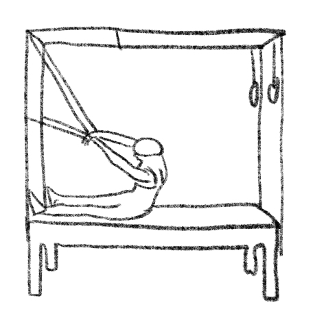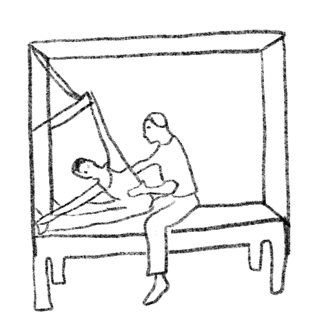 Long sitting, pushing bar (light springs up), feet against uprights.