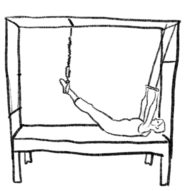 Light spring down on bar, holding bar, feet on trapeze frame.