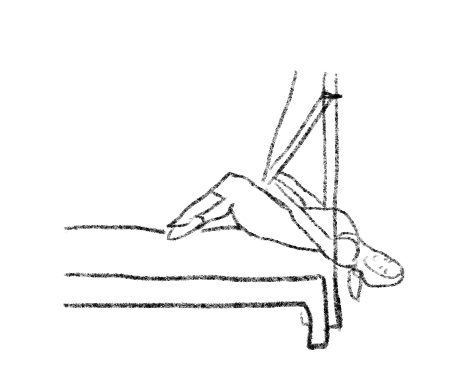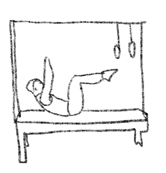 仰卧,轻弹簧上挂塔杆,头靠床缘。