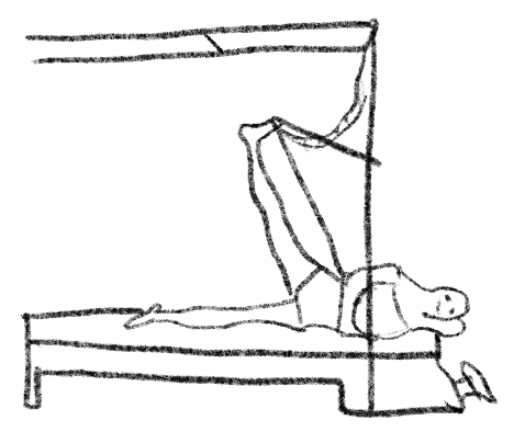 起始位:侧卧。吐气:将杆往上推开伸膝;吸气:慢慢屈膝回。想象腿如展开的翅膀。