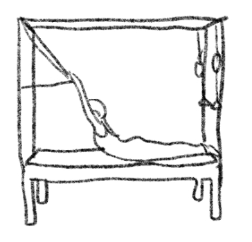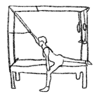 起始位:俯卧,手放最宽,手臂伸直过头,手握塔杆,双脚在秋千床末端或是超过末端。【只做胸椎伸展】;保持手臂伸直,吐气时把塔杆往身体方向拉,脊椎后仰做胸椎伸展后仰的动作。吸气时回到起始位置,脊椎分节往下卷。【全伸展后仰】;吐气时,拉塔杆过头的后侧,用吸气带动胸椎后仰伸展,保持最下段的肋骨在床上,直到胸椎后仰伸展,可以将塔杆继续往上推,直到全部脊椎都能伸展后仰。吐气时回到起始位置,当塔杆回到头后侧的位置时脊椎往下卷。可改变呼吸方式,做全伸展后仰时吐气,以增加腰椎的支撑及肩胛的控制。