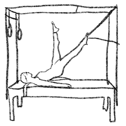 Starting position: Supine, head away from bar, arms by sides, knees bent 90°, balls of feet on bar. Cue: Exhale, straighten knees and hips, pressing bar toward uprights; Inhale, bend knees and hips, bar returns toward ceiling; after straightening, continue pushing bar, rolling spine up to bridge, weight on scapulae; Exhale, roll spine down until body on table, knees bent.