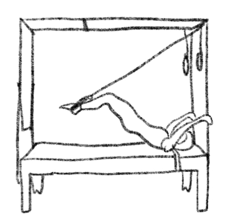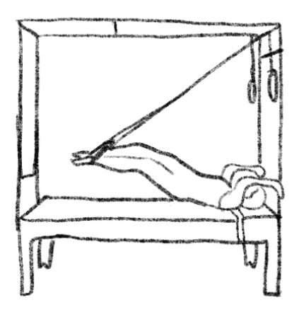 【起始位】仰卧,双手抓直立杆,脚套套环,髋关节屈曲斜板姿势(Pike)。【呼吸/动作】吐气,手推杆,腿下压,身体先到斜角平板姿势,然后做抛物线到身体后仰姿势。吸气,膝盖弯曲,髋伸展,直到脚趾碰到或擦过垫子。脚往床台尾端滑动,到身体微浮在床台上的平板姿势。动作连续而顺畅。髋屈到平板,抛出到后仰,往外射出到微浮的平板,髋关节屈曲到斜板。呼吸配合动作